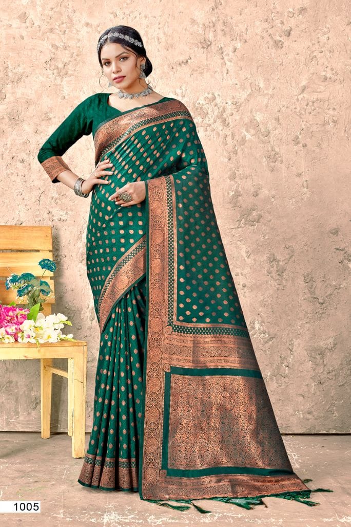 A green Banarasi saree ranging from light shades like mint green to deeper tones like emerald or forest green. These sarees often feature intricate zari work, which is the use of gold or silver metallic threads woven into the fabric to create intricate designs, motifs, or patterns. The zari work adds a touch of glamour and richness to the saree, making it a popular choice for weddings and festive occasions. The combination of the green color and Banarasi weaving techniques creates a stunning and timeless saree that celebrates Indian traditions and craftsmanship.