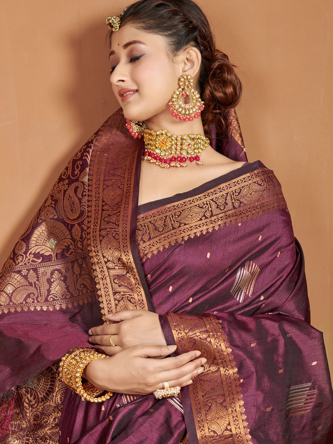 The dark pink color adds vibrancy and sophistication to the saree, making it a popular choice for special occasions such as weddings and festivities. Dark pink Banarasi sarees often incorporate elaborate zari work, which involves weaving gold or silver metallic threads into the fabric to create intricate patterns, motifs, or borders. This zari work enhances the beauty and elegance of the saree.