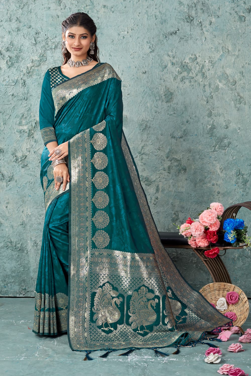 A Rama color Banarasi saree refers to a saree in the shade of Rama, which is a light and serene shade of green. The Rama color adds a refreshing and graceful touch to the saree, making it a popular choice for festive occasions, weddings, and cultural events. The combination of the Banarasi craftsmanship and the Rama color creates a beautiful and elegant saree that showcases the rich cultural heritage of India.